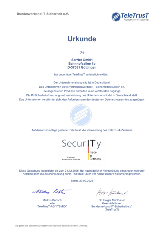 SerNet has been part of the TeleTrusT competence network since 2015 and has continuously held the ITSMIG trust mark and the “IT Security made in EU” seal for years.
